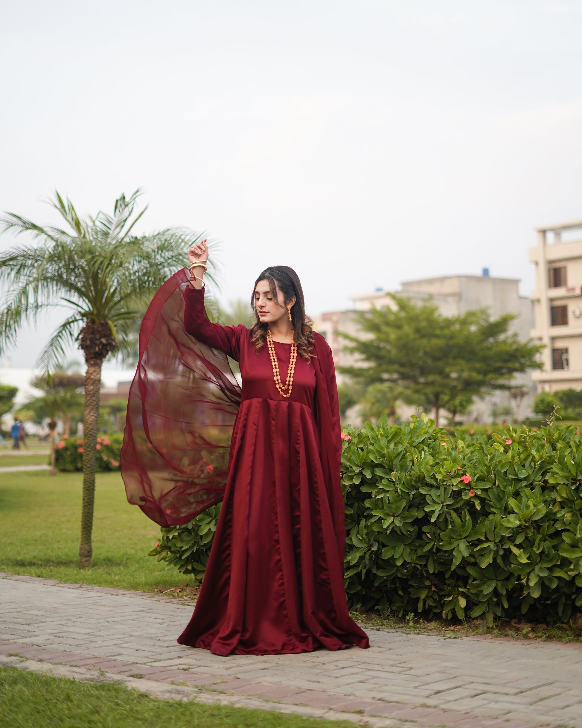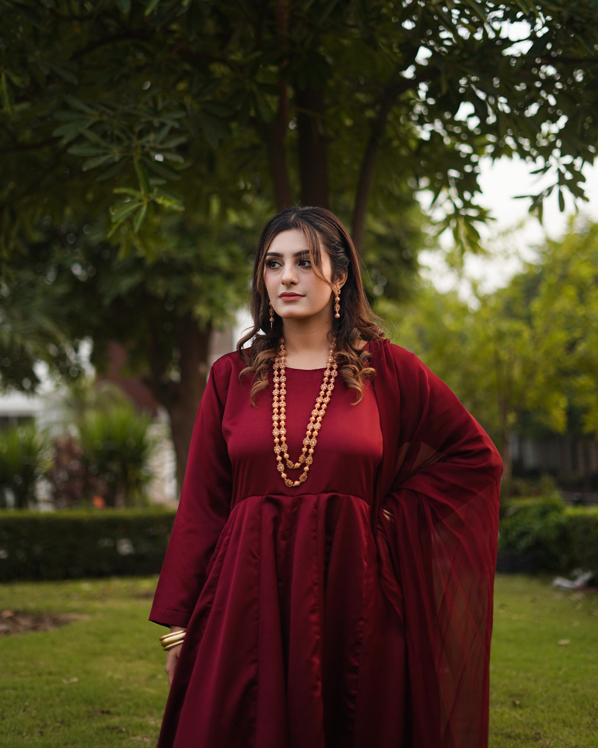 “Mehroon” captures the allure of deep elegance with its rich hue and graceful silhouette. Crafted from premium fabric with refined detailing, it blends bold sophistication with timeless charm. Designed for the woman who embraces confidence and grace, this ready-to-wear piece is perfect for both refined gatherings and special occasions.